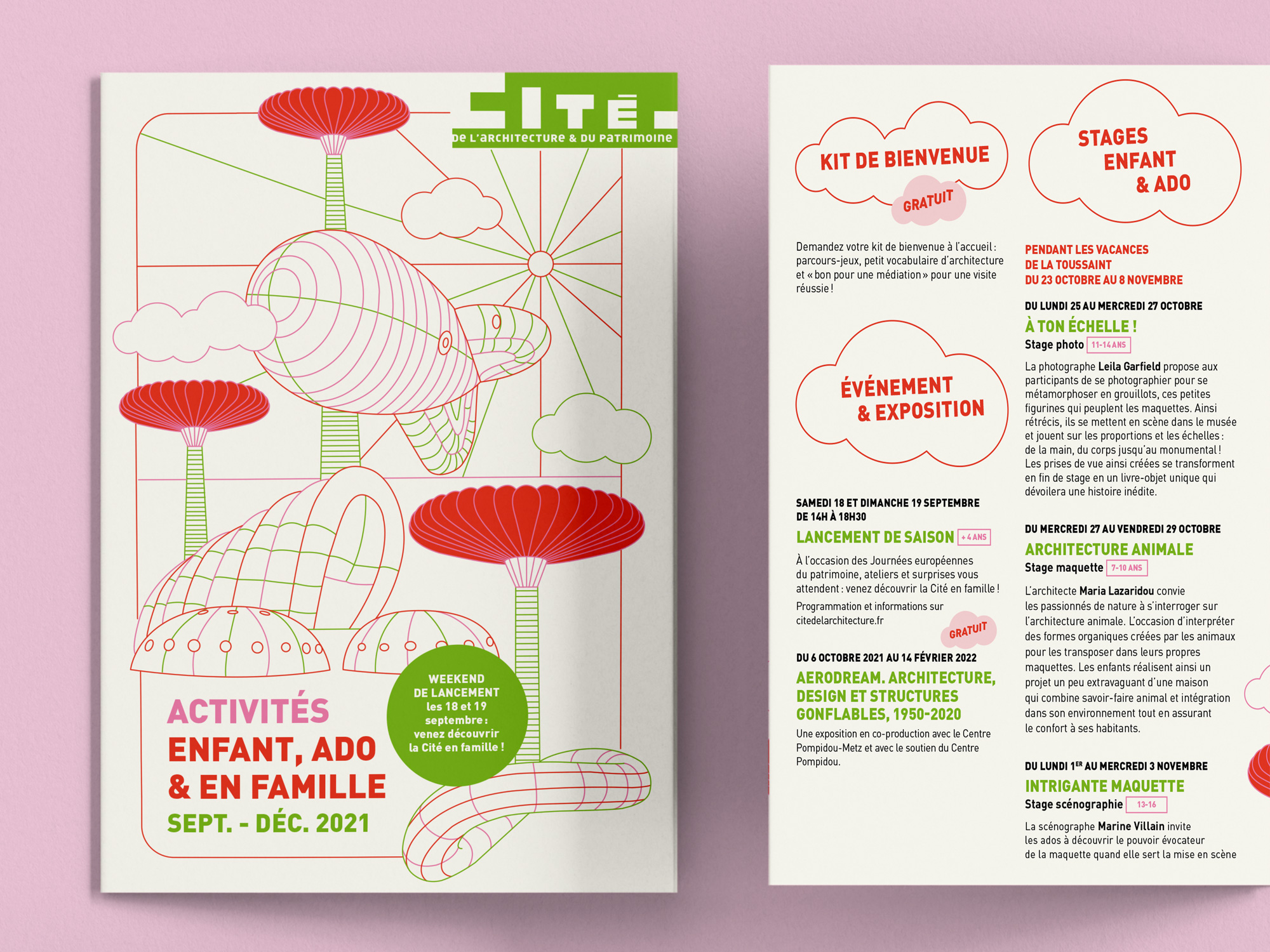 Illustrations et graphisme du dépliant 4 volets plis portefeuille sur la thématique des structures gonflables en architecture.