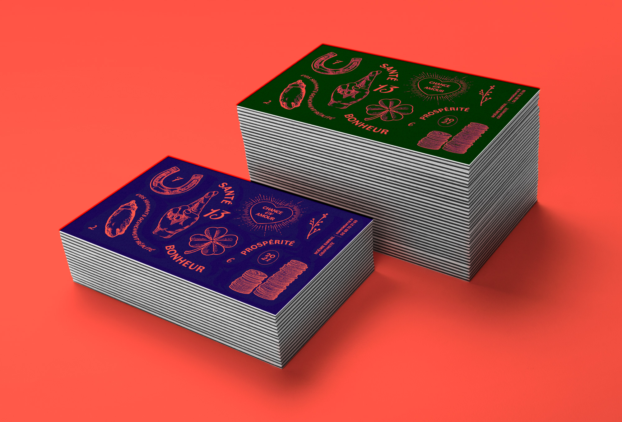 Impression letterpress marquage à chaud cuivré en sur trois papiers teintés masse. Format A6.